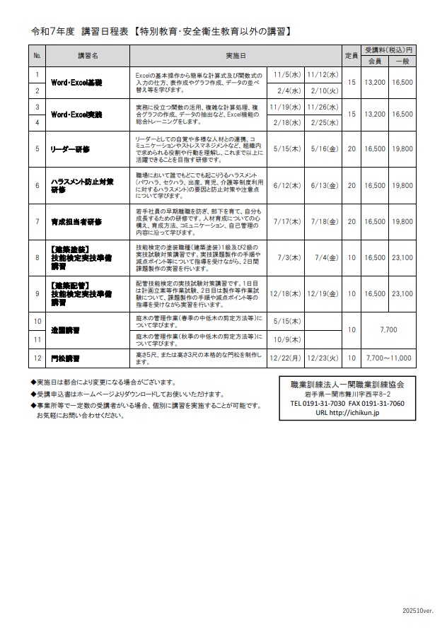 ※申込みが定員に達し次第締め切らせていただきます。 ※申込者が少数の場合は中止となることがありますのでご了承ください。 ※申込締切後にお客様のご都合でキャンセルされる場合、納入済みの受講料は一切返金できかねますのでご了承 ください。